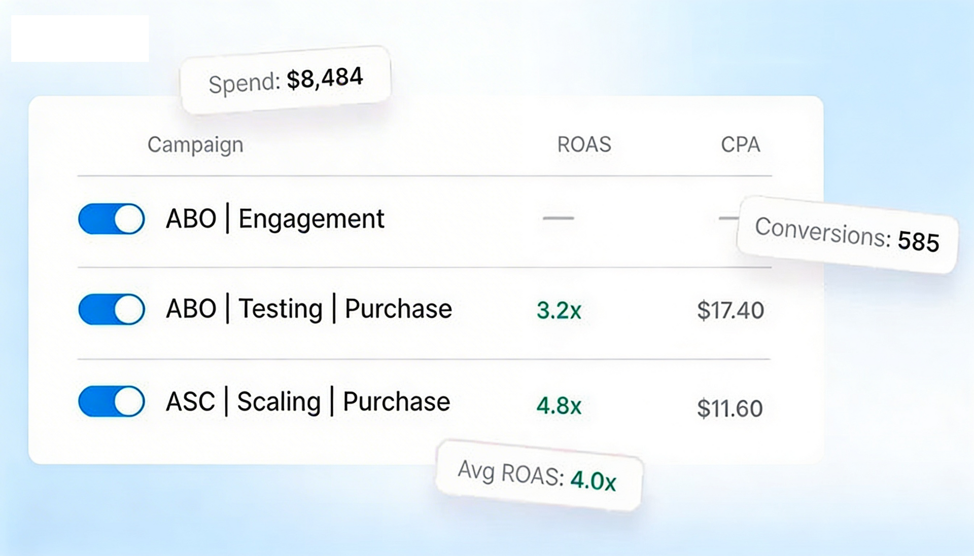 With this service, you'll have expert media buyers and creative strategists working to maximize your campaign performance across Facebook and Instagram. We test multiple ad variations, refine targeting, and continuously optimize to drive leads, sales, and revenue for your business.